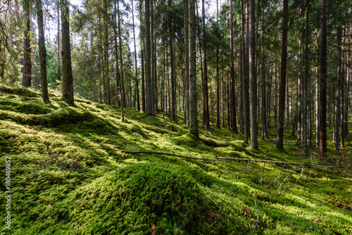 Fototapeta premium Old forest with moss covered trees and rays of sun