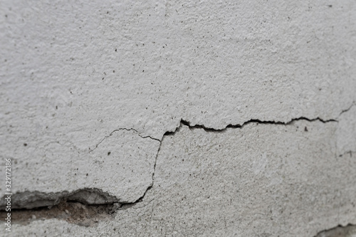 Obraz premium Old foundation and plaster wall with cracks. Building requiring repair closeup.