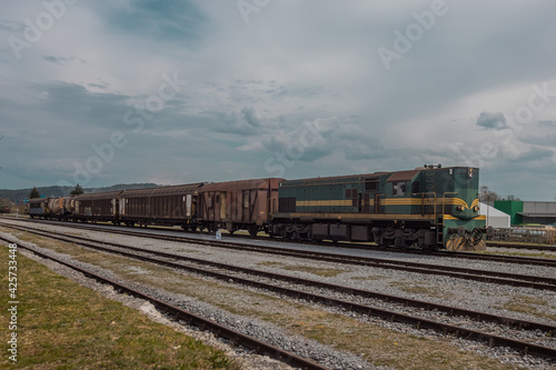 © Anze, Fototapeta premium Old freight train with old and noisy diesel engine. Mixed waggons on a cloudy day.
