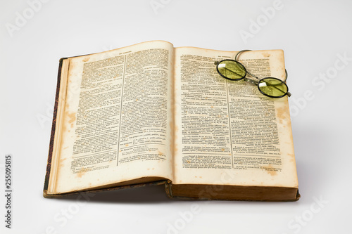 Obraz premium Old french dictionary lies open with old spectacles against a white background