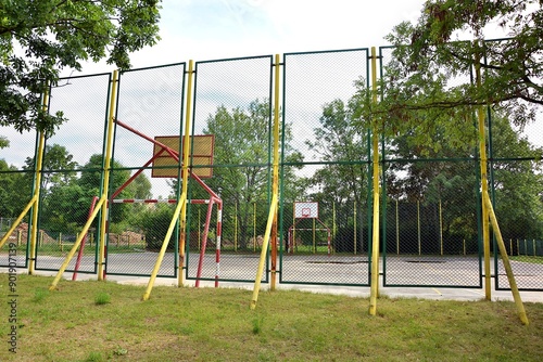 Fototapeta premium Old from the times 60s , 70S and now , fenced dangerous concrete playground - football pitch and basketball