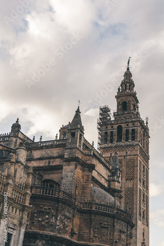 Fototapeta premium old gothic Seville Cathedral under cloudy sky, spain