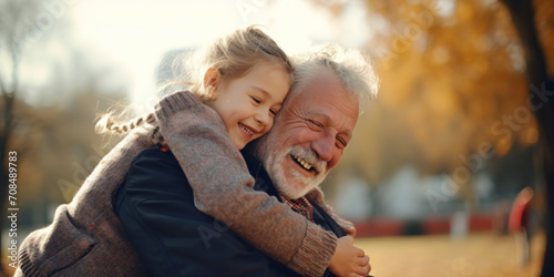 Obraz premium Old grandfather hugs his young granddaughter outside in the park. blurred background