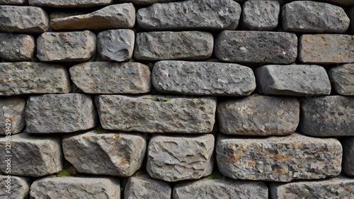 © julfiar, Obraz premium Old grey long stone wall close up. Background texture for backdrops or mapping