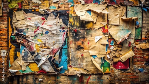 © Indigo Studio, Fototapeta premium Old grunge torn collage posters on crumpled paper background surface with graffiti painting