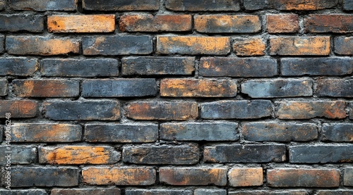 © Dilawar, Obraz premium Old Grungy Black Brick Wall with Orange Rust Stains – Vintage Industrial Texture Background