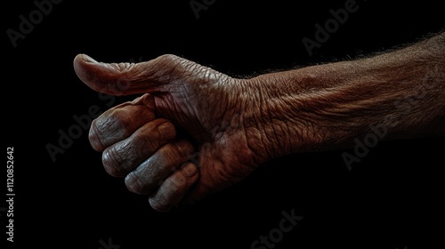 © VirtualVista, Fototapeta premium Old hand gesturing thumbs up symbolizing approval and encouragement against a black background showcasing textured skin details and aged features.