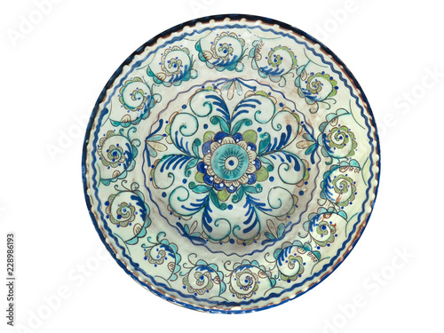 © alexrow, Naklejka premium Old handmade pottery plate isolated on white