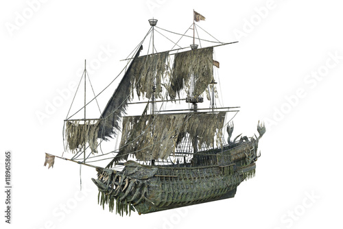 Fototapeta premium Old haunted ghost pirate ship with torn sails. Isolated 3D render.