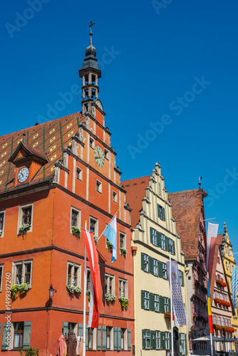 Fototapeta premium Old historic buildings with flags in the old town of Dinkelsbühl