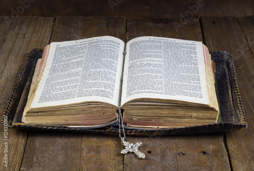 © Madele, Fototapeta premium Old Holy Bible on rustic wood table with cross book mark