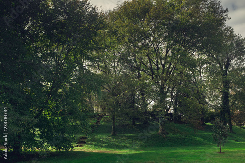 © Amy Buxton, Fototapeta premium Old house behind trees at the top of a hill.