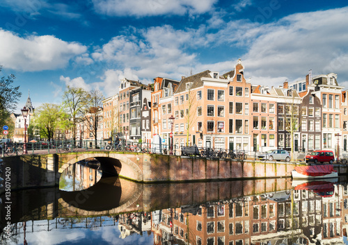 Naklejka premium Old houses facades over canal with mirror reflections, Amstardam, Netherlands