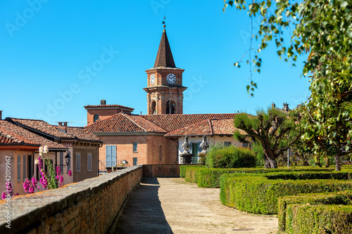 © Rostislav Glinsky, Fototapeta premium Old houses, park and belfry under blue sky in Govone, Italy.