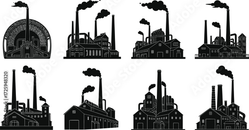 © Musa's Word, Fototapeta premium Old industrial factory buildings with smoke stacks, vintage chimneys, retro power plants, warehouse manufacturing sites, black silhouette industry illustration design