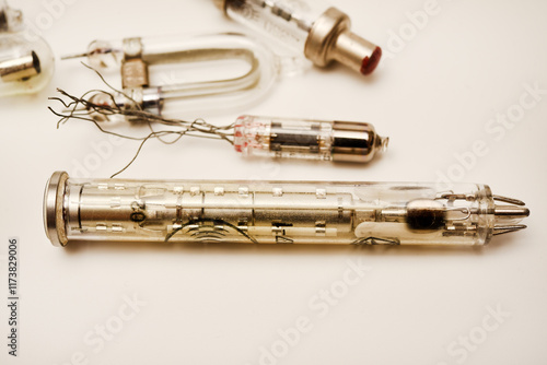© Lushchikov Valeriy, Fototapeta premium Old lamps from radio electronics. Lamps from calculating devices and lighting.