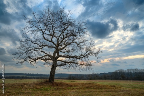 Fototapeta premium Old Leafless Tree in French Countryside under Cloudy Autumn Sky. Scenic...