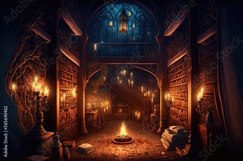 Obraz premium Old library interior with candles, fireplace and mystic books