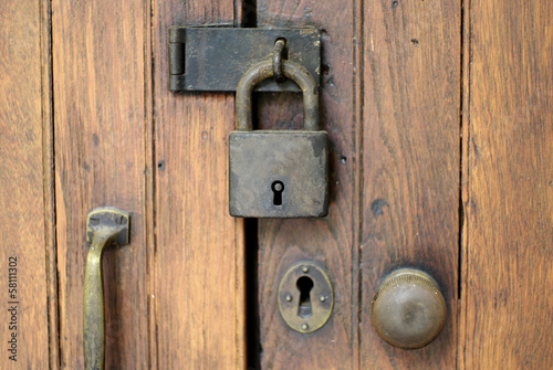 Fototapeta premium old lock on wood door, security abstract
