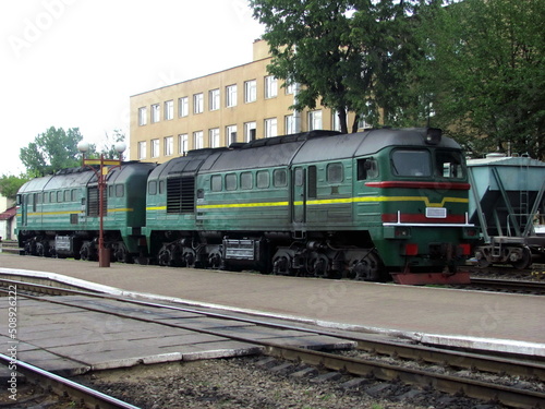 © Ivan Koliadzhyn, Fototapeta premium Old locomotive at the train station in the evening