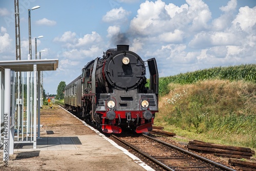 © yaalan, Obraz premium Old locomotive on the rural railway
