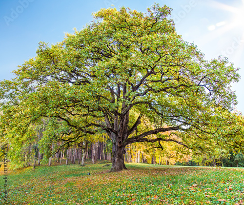 © Aleksandar Todorovic, Naklejka premium Old lonely oak tree in the park against the blue sky with sun in Serbia.