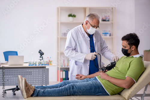 Obraz premium Old male doctor measuring young patient's blood pressure