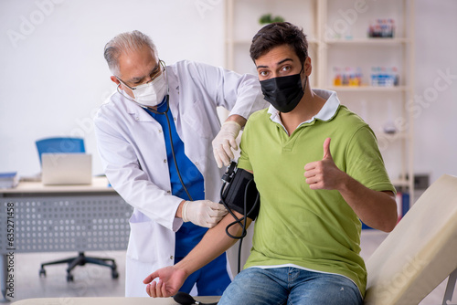 Fototapeta premium Old male doctor measuring young patient's blood pressure