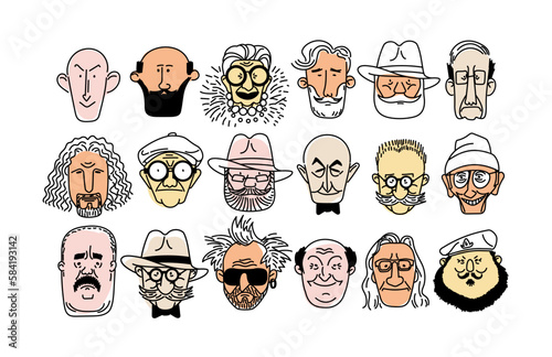 © mozart3737, Fototapeta premium Old man face, senior, mature, different age generation. Adult people, diverse characters set. Elderly person. Collection of facial expressions. Vector cartoon hand drawn sketch line Illustration