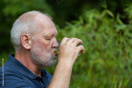 © Andreas, Fototapeta premium old man is drinking softdrink in the garden