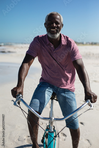 © wavebreak3, Obraz premium Old man with a bike at the beach