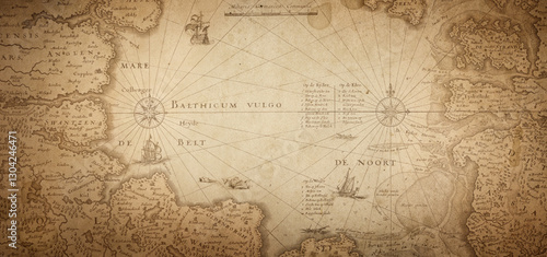 © Tryfonov, Obraz premium Old map collage background. A concept on the topic of sea voyages, discoveries, pirates, sailors, geography, travel .