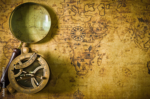 © meen_na, Naklejka premium old map with compass and Magnifier