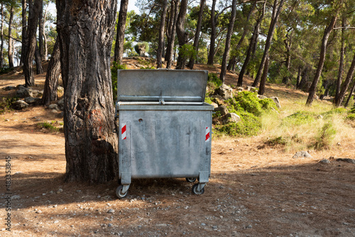 © Yasin, Fototapeta premium Old metal garbage container on the forest, trash dumpster. Dirty refuse bin. Garbage containers on the park. Recycling industry. Ecology, beautiful natural environment. Recycle bin front view.