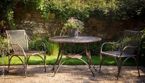 Fototapeta premium old metal garden table and chairs in a rustic garden
