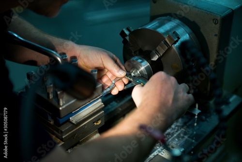 © venars.original, Obraz premium Old metal lathe machine, retro machine background.