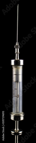 © Alexey Wraith, Naklejka premium Old metal syringe with glass liquid container on a black background