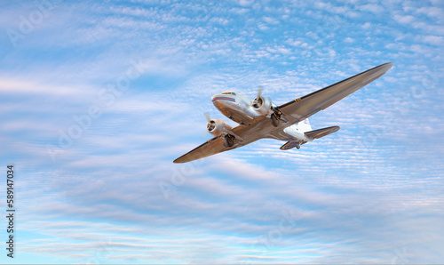 © muratart, Obraz premium Old metallic propeller airplane in the sky, sunset clouds in the background