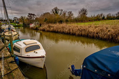 Fototapeta premium Old motor boats and cruisers moored up in a dyke off the Norfolk Broads on a dull and overcast winter's day