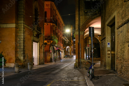 © Ekaterina Belova, Fototapeta premium Old narrow street in Bologna at night, Emilia Romagna, Italy. Architecture and landmark of Bologna. Cozy cityscape of Bologna.