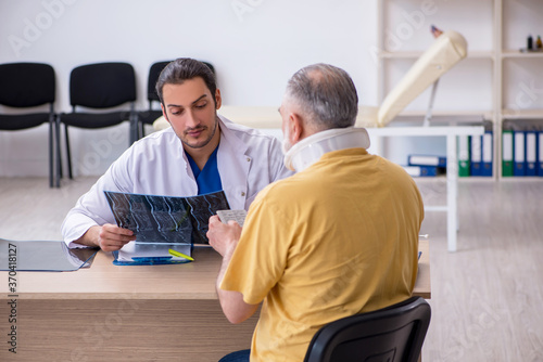 Fototapeta premium Old neck injured man visiting young male doctor radiologist