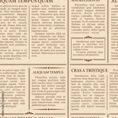 © Vector Tradition, Obraz premium Old newspaper seamless pattern, vector background of vintage text with columns, articles and titles. Print of daily news, newsprint page texture. Newsletter, magazine or journal media scrap sheet