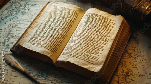 © Rere_Art151, Obraz premium Old open book and feather quill pen on map