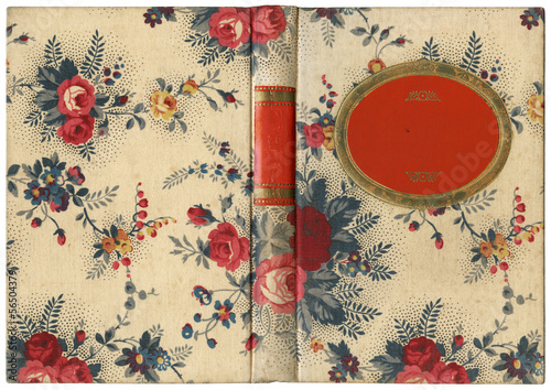 © DrObjektiff, Naklejka premium Old open book cover in canvas with floral roses drawing and rounded red and golden frame