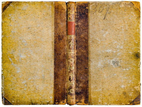 © DrObjektiff, Fototapeta premium Old open book cover - worn scratched textured natural paper, brown leather spine, golden abstract ornaments and empty red label - circa 1810
