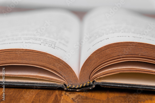 © Adga, Fototapeta premium Old open book on a wooden table. White background. closeup