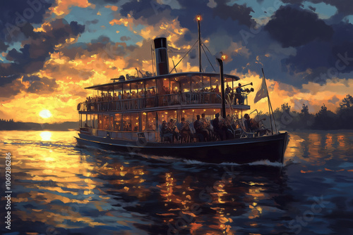 Naklejka premium Old Paddle Steamer with Jazz Band Playing on Deck – Summer Evening Cruise...