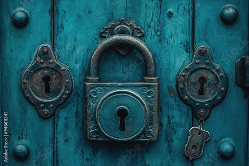 Fototapeta premium Old padlock securing a wooden door with a key hanging
