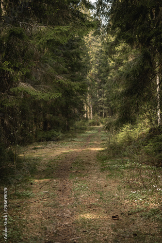 © Magnus, Fototapeta premium Old path leading into a lush green fir forest