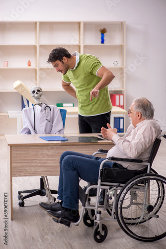 Fototapeta premium Old patient in wheel-chair visiting skeleton doctor